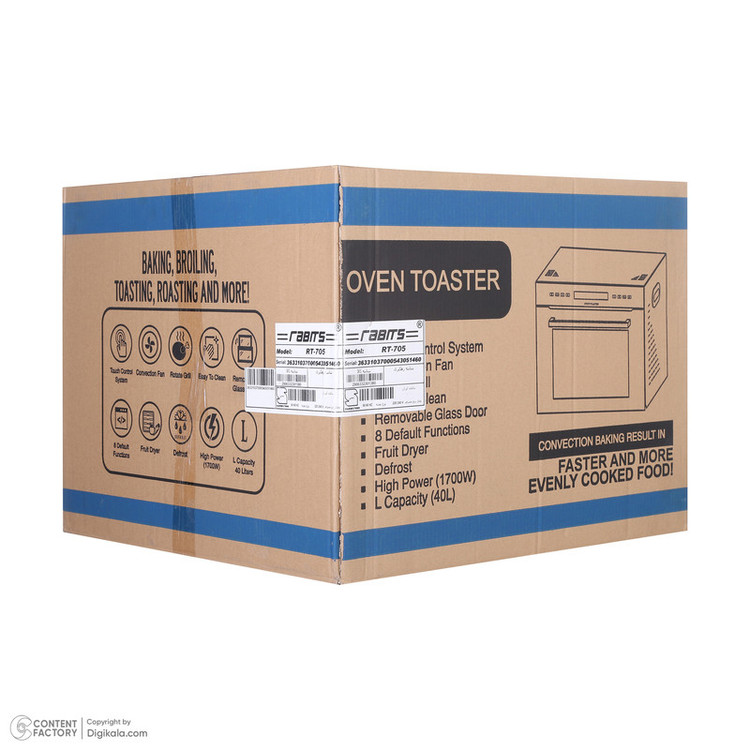 جدیدترین فر رومیزی شرکت رابیتس RT 705 که دارای محفظه ۴۵ لیتری با شیشه های دو جداره جدا شونده می باشد. این محصول از فن های کانوکشن قوی جهت گردش هوا و خنک کردن دستگاه استفاده می کند. توان حرارتی بالای ۲۰۰۰ وات و شلف جدا شونده و نیز سینی لعابی و لامپ سرامیکی از دیگر خصوصیات این دستگاه می باشد. پوشش لعابی داخل دستگاه آسان تمیز شو می باشد .این دستگاه دارای ۸ برنامه پخت از جمله یخ زدایی و جوجه گردان می باشد