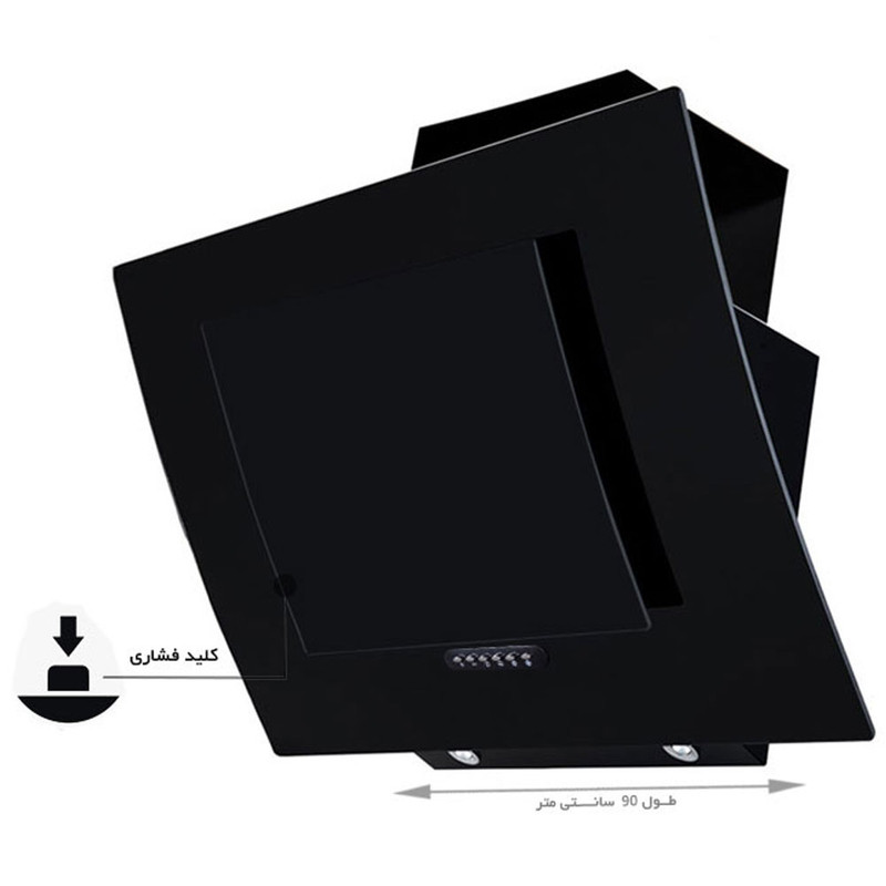 درب اتوماتیک ندارد نمای محصول : شیشه سکوریت مشکی مقاوم در برابر حرارت و ضربه دارد سایز عرض هود : 90 سانتی متر است توان موتور : 200 وات میباشد قابلیت نصب فیلتر ذغالی دارد ( قابل نصب در آشپزخانه های بدون خروجی هوا )